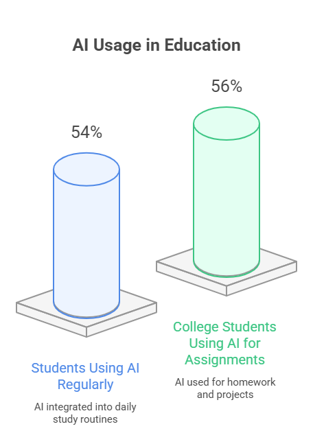 - 54% of students use AI daily or weekly – according to DemandSage, showing AI has become part of regular study routines rather than occasional help
