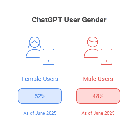 According to Exploding Topics, 64.32% of ChatGPT users are male, while 35.68% are female. But recent data shows this gap narrowing, with some sources reporting female users rising to 52% versus male 48% as of June 2025.