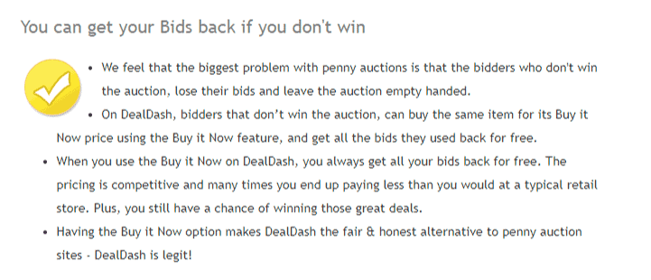 However, unlike other penny auction websites, DealDash also offers you an option of getting your used bids back if you choose to buy the product at the original price. This is what separates