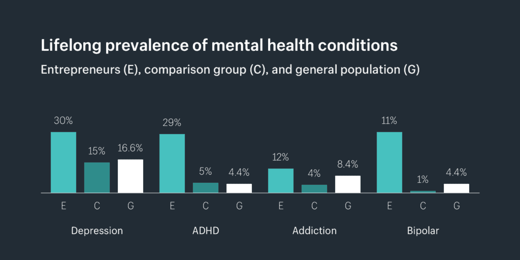 Entrepreneurs are known to be twice more likely to suffer from depression than traditional employees.