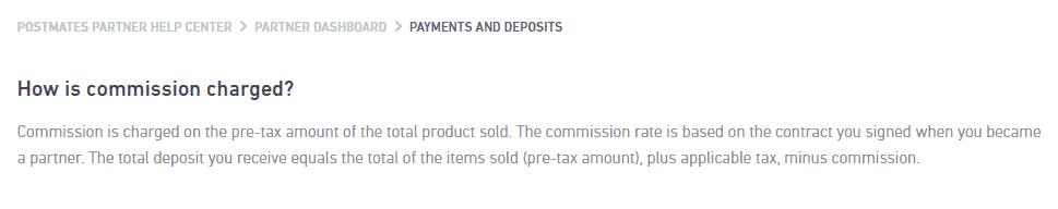 Postmates usually charges a commission between 15 and 30% on the pre-tax amount of the total product sold. The commission, however, varies for every partner depending on the contract they signed with the company.