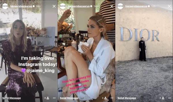 For instance, the fashion magazine Harper’s Bazaar turned over their Instagram story to Jamie King for an event, where Jamie showed her styles, outfits, make-up, etc.