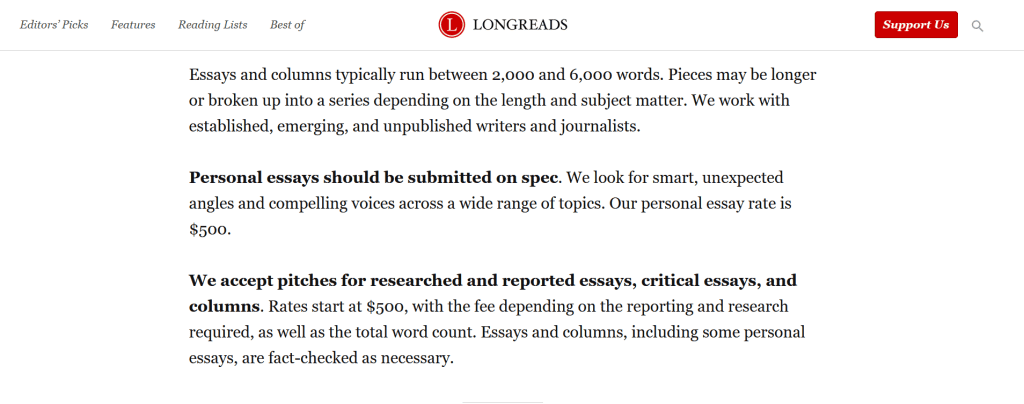 - Longreads: This website publishes and promotes well-written, longer-form content. They pay $500 for articles that are at least 2,000 words.