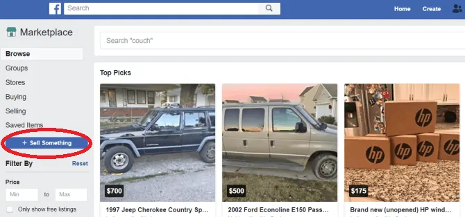 - Once in Facebook Marketplace, click on “+ Sell Something”