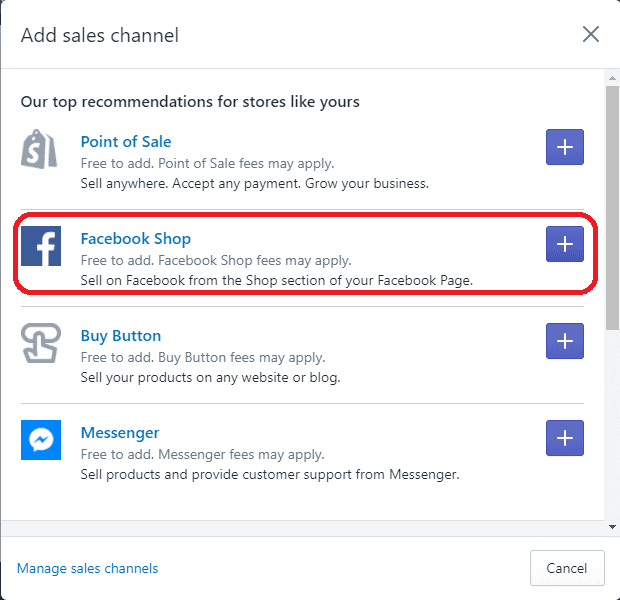 - Log into Shopify and click the + button beside the Sales channels heading from your Shopify admin page
