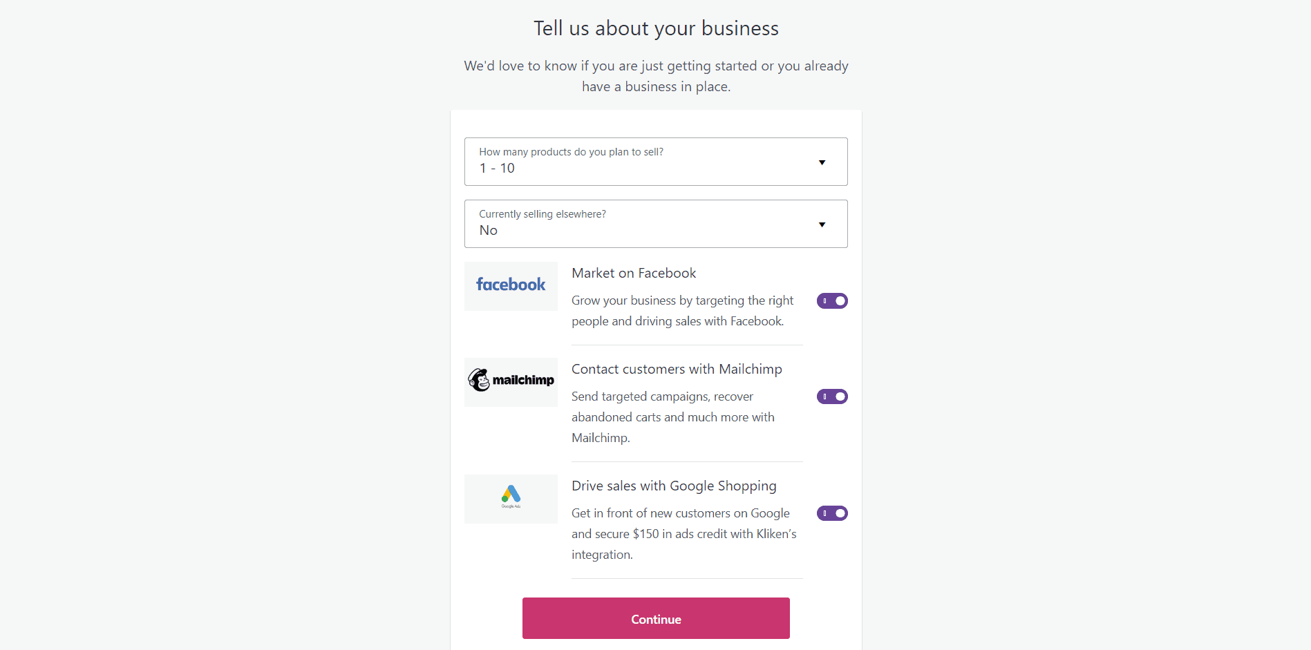 After clicking on ‘create your store’, it would ask you more general questions about your annual revenue figures, your industry (Electronics, Food & Drink, Home & Garden, etc.), your name, address, etc.