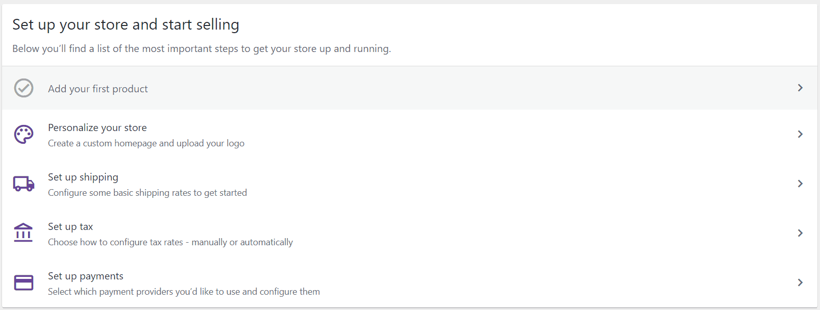 Once you’ve finished the setup, you’ll see the ‘Add your first product’ tab below the ‘Set up your store and start selling’ heading.