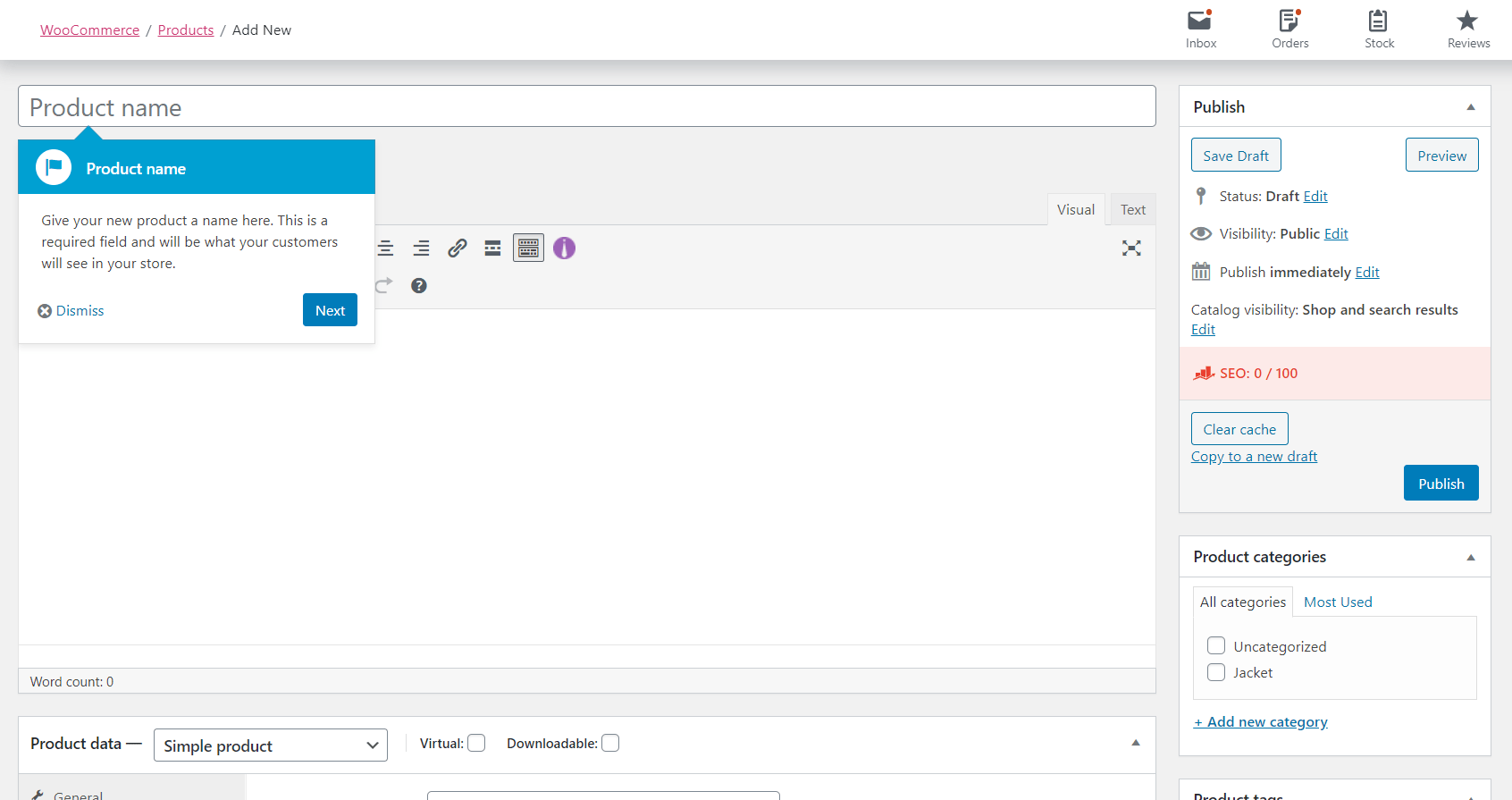 In case you skipped the setup-wizard walk-through, then using the side menu, you can go to ‘Settings’ –> ‘Products’ –> ‘Add New’. Then