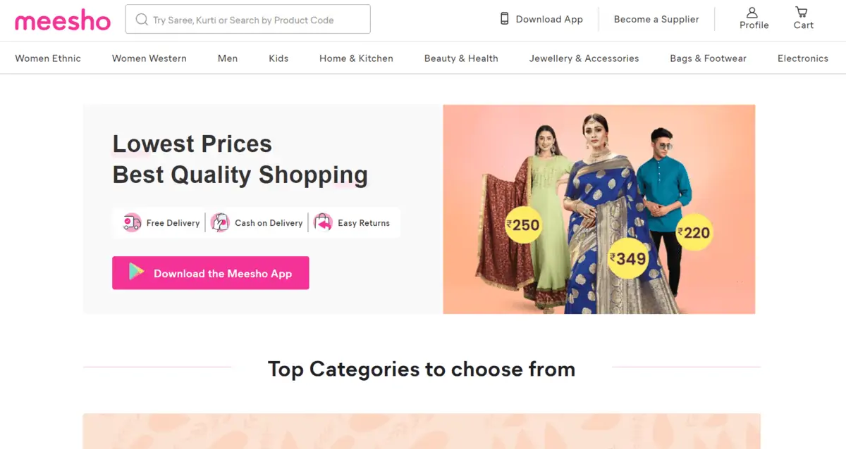 Here’s how it works. Sellers list their products on Meesho’s platform. Then, resellers (mostly women looking to earn extra income) browse these products, add their markup, and share them across their social networks. When someone from their network buys, the reseller earns a commission without handling inventory or logistics.