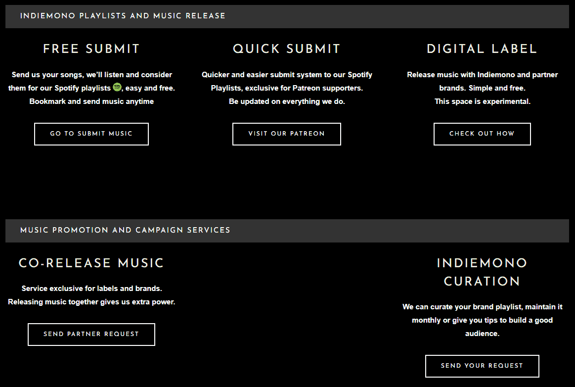 Indiemono is a legit Spotify playlist curator-cum-music-label which lets music producers and artists submit their piece for review for free. However, the company also provides paid partnership options where the artist and labels can co-release their music with the Indiemono digital label and cater to a bigger audience.