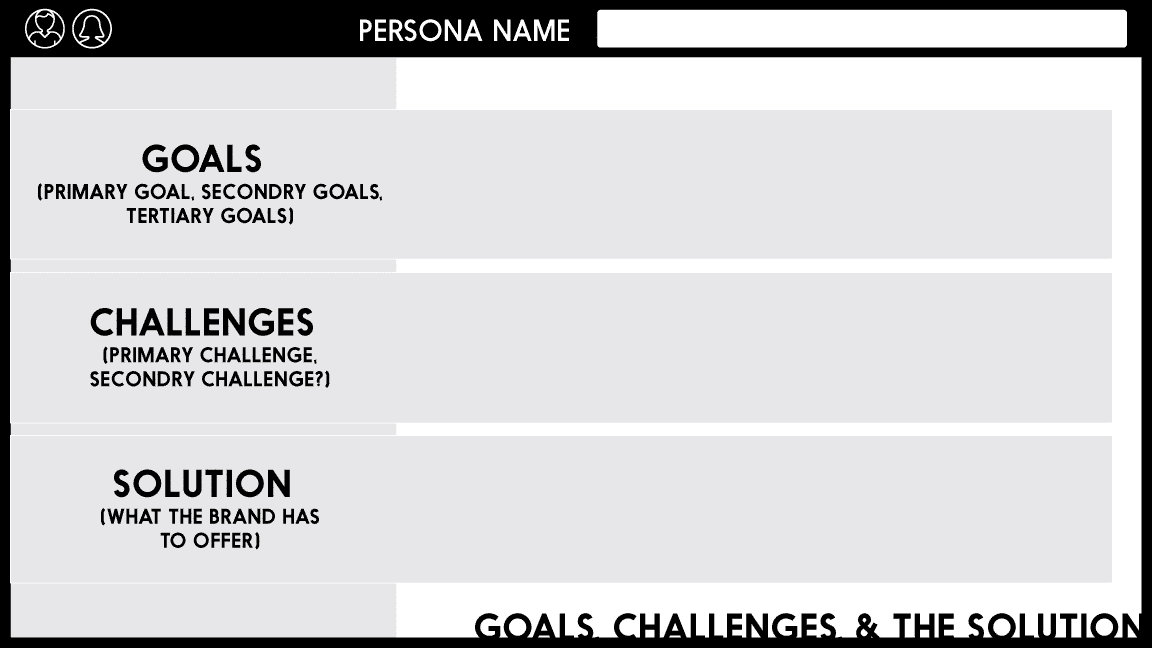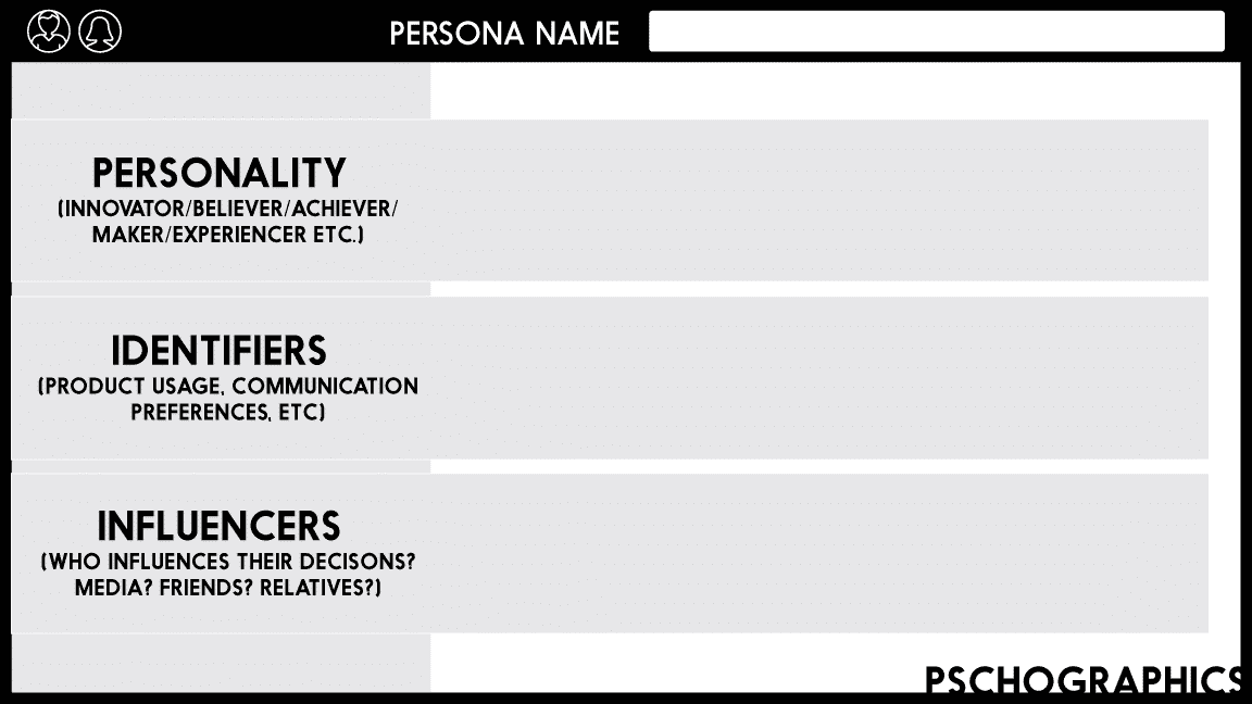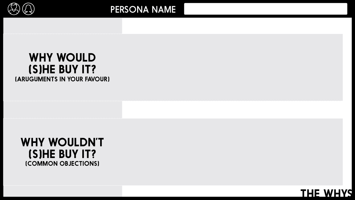 Our buyer persona template is made up of four sections. The first section talks about the demographics of the customer, second talks about the psychographics, third about goals, challenges, and solutions, and fourth gives the arguments about why he will and will not choose the brand’s offering.