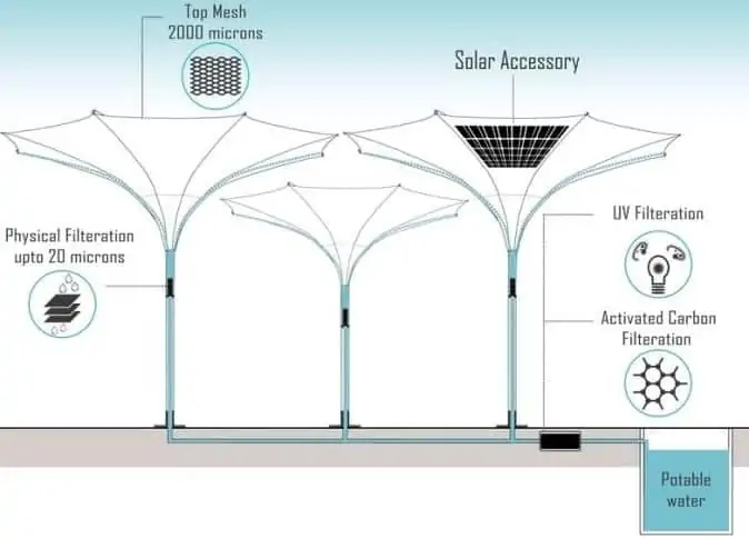 Even though rainwater is the purest source of water, it is squandered. Samit Choksi and Priya Choksi, co-Founders of ThinkPhi, created Ulta Chaata to preserve water in its purest form in open spaces. It consists of a steel unibody and a flexible inverted canopy. It includes solar panels for energy generation, rainwater purification (water purifier), energy storage, live lighting, active sensors, mobile controls, and a charging station. It is also a very large shading system, under which nearly 20 people can sit, or two cars can be parked. In a nutshell, it generates a single integrated product that builds green infrastructure.