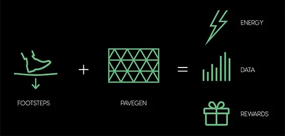 Founded by Laurence Kemball-Cook, Pavegen’s goal is to obtain kinetic energy from the regular movement of people and transfer it into electrical energy. The weight of people walking on the top surface causes generators under the tiles to rotate, producing electricity by electromagnetic induction. It produces about 3 joules per footstep or about 5 watts of continuous power. This energy can power local applications like lighting, sensors, and data collection and transmission or can be stored in batteries.